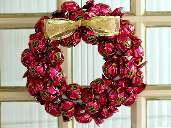 3 - Continue fixando os bombons até preencher toda a guirlanda.