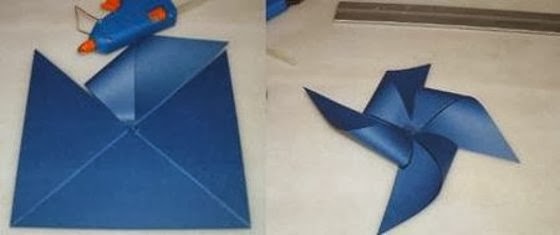 Para fazer cata-vento em duas cores, basta sobrepor um quadrado de cor diferente em cima do primeiro. Pegue uma ponta de cada lado (que será dobrada) para o centro, e cole-a lá.