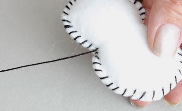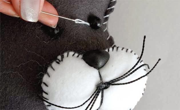 4 - Use a linha preta para chulear o focinho, arremate e mantenha a linha longa ainda na agulha.