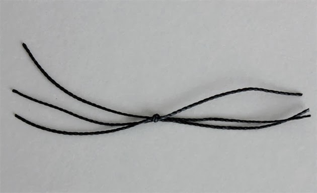 6 - Faça o bigode recortando três pedaços de fio encerado com cerca de 15 cm cada, junte e dê um nó no centro.