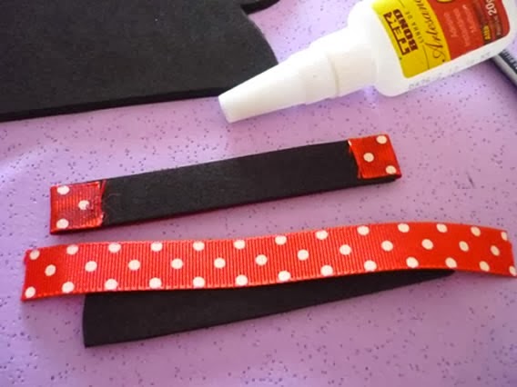 Recorte duas tirinhas do EVA preto de 1,5cm de largura e cole a fita da Sinimbu, como mostra a foto.